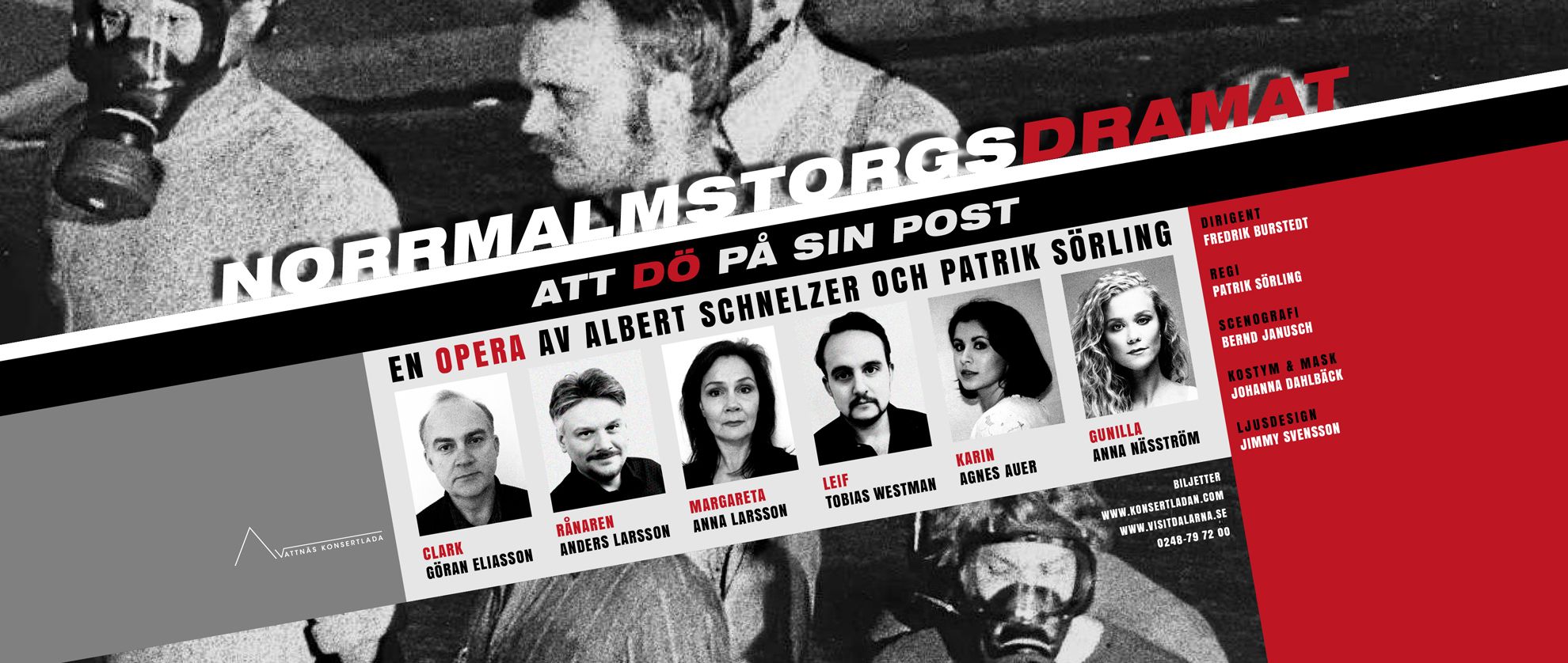 Jag kände att det hade varit så fantastiskt att skapa en opera om en stor händelse som merparten av vår publik har en relation till. Jag minns när jag plötsligt ropade till Anna: "NORRMALMSTORGSDRAMAT! DET ÄR JU EN OPERA! Så när vi kontaktade en av landets mest intressanta komponister idag och han genast sa ja till att uppföra sin första opera hos oss i Vattnäs fanns det stor anledning att jubla. Vi har länge älskat Albert Schnelzers musik och teamet blev fullbordat när den fine regissören och librettisten Patrik Sörling anslöt sig. Vi ser med stor spänning fram emot att få börja repetera den här nya svenska operan som håller på att skapas: Norrmalmstorgsdramat – att dö på sin post!